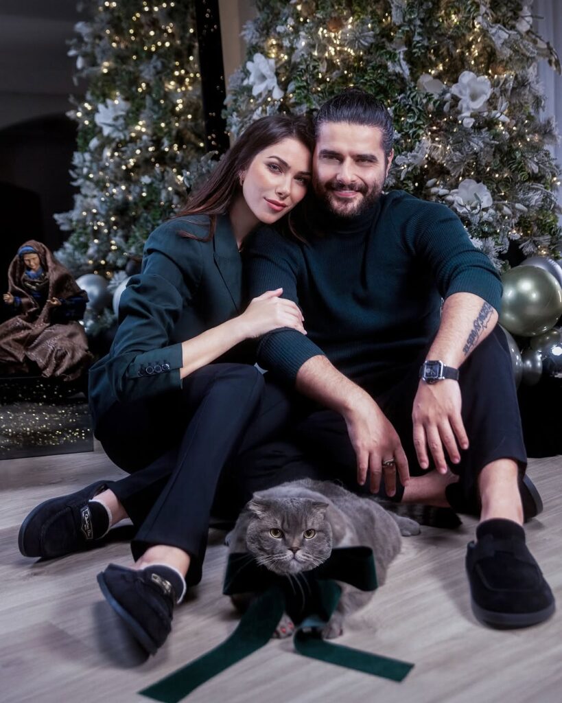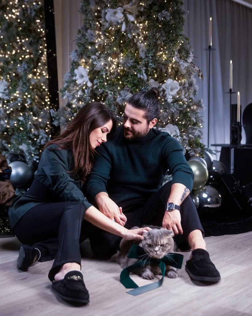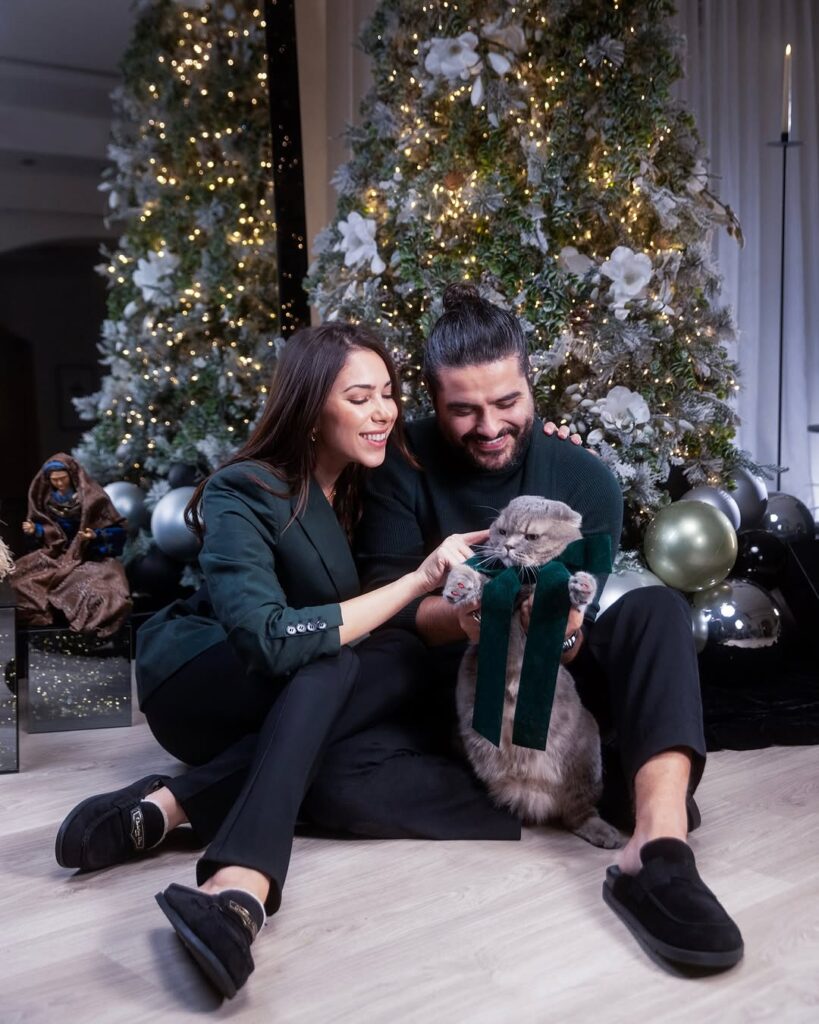 في الصور التي نشرها، ظهر الثنائي بأجواء مليئة بالدفء والسعادة، جالسين بجانب شجرة الكريسماس المزينة بشكل أنيق، حيث أضافت الأضواء والديكورات لمسة فريدة. ورافقهما في الصور قط لطيف، مما زاد من أجواء العائلة الحميمية.