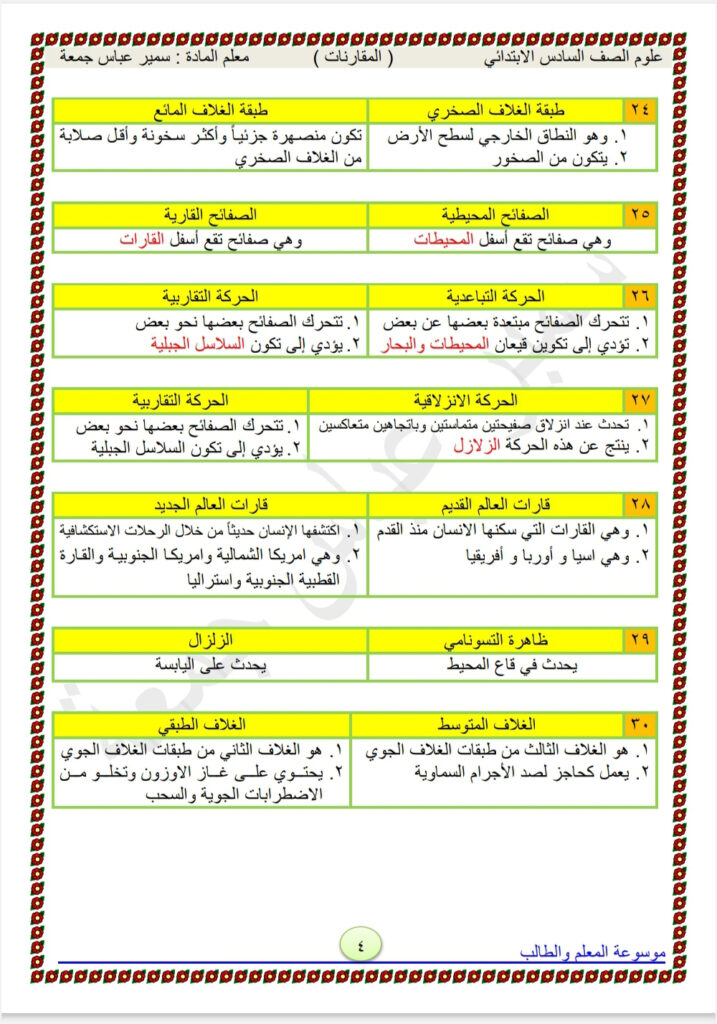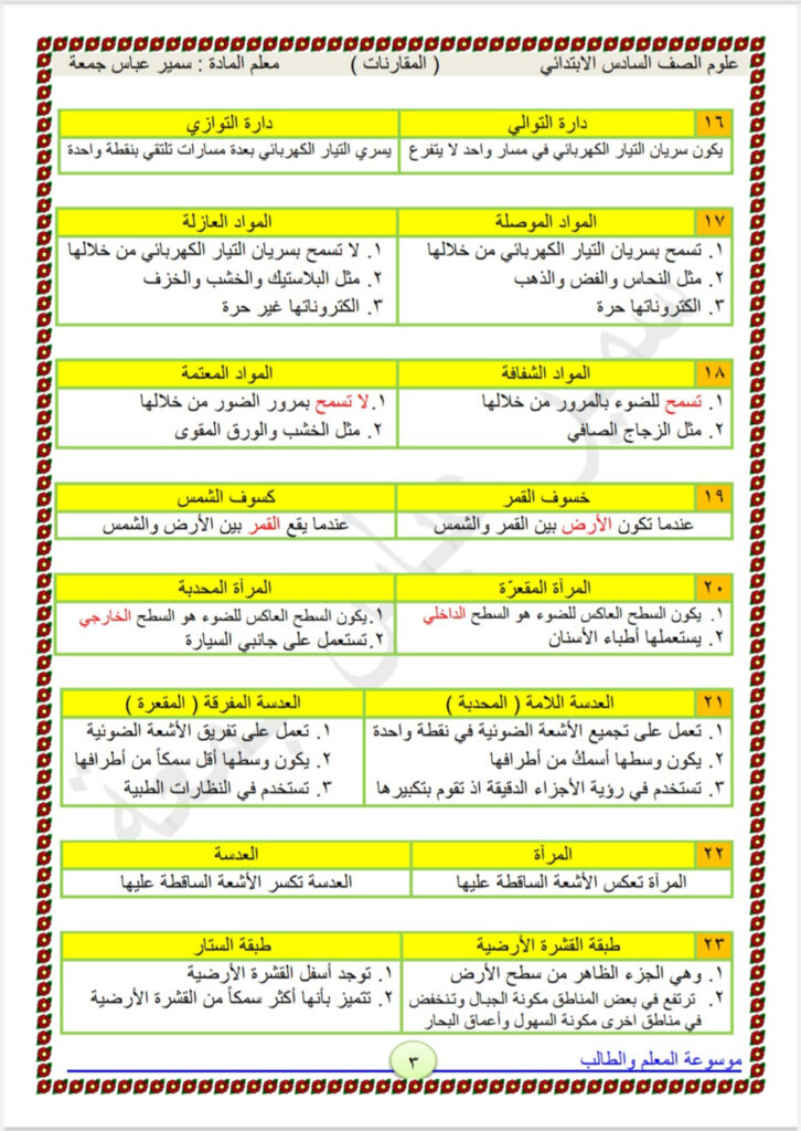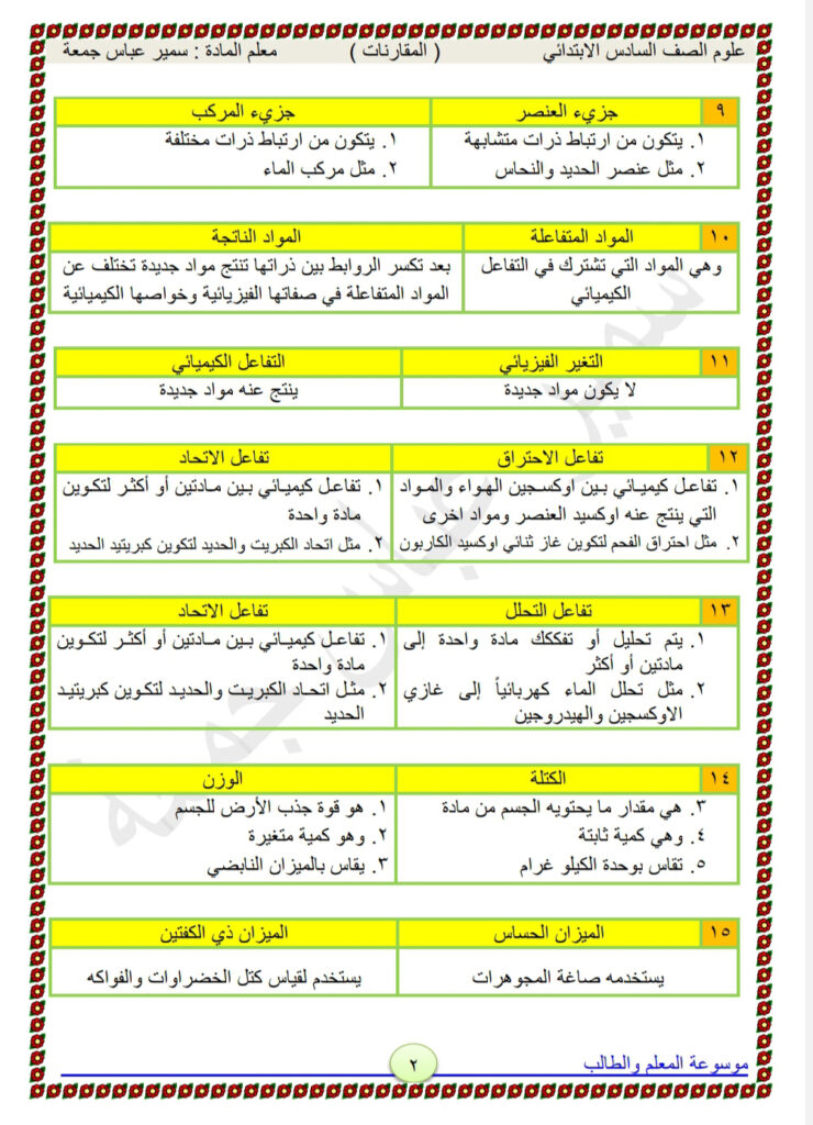 مقارنات العلوم ننشر اليكم جميع واهم مقارنات الكتاب للصف السادس الابتدائي لمادة العلوم 2025
