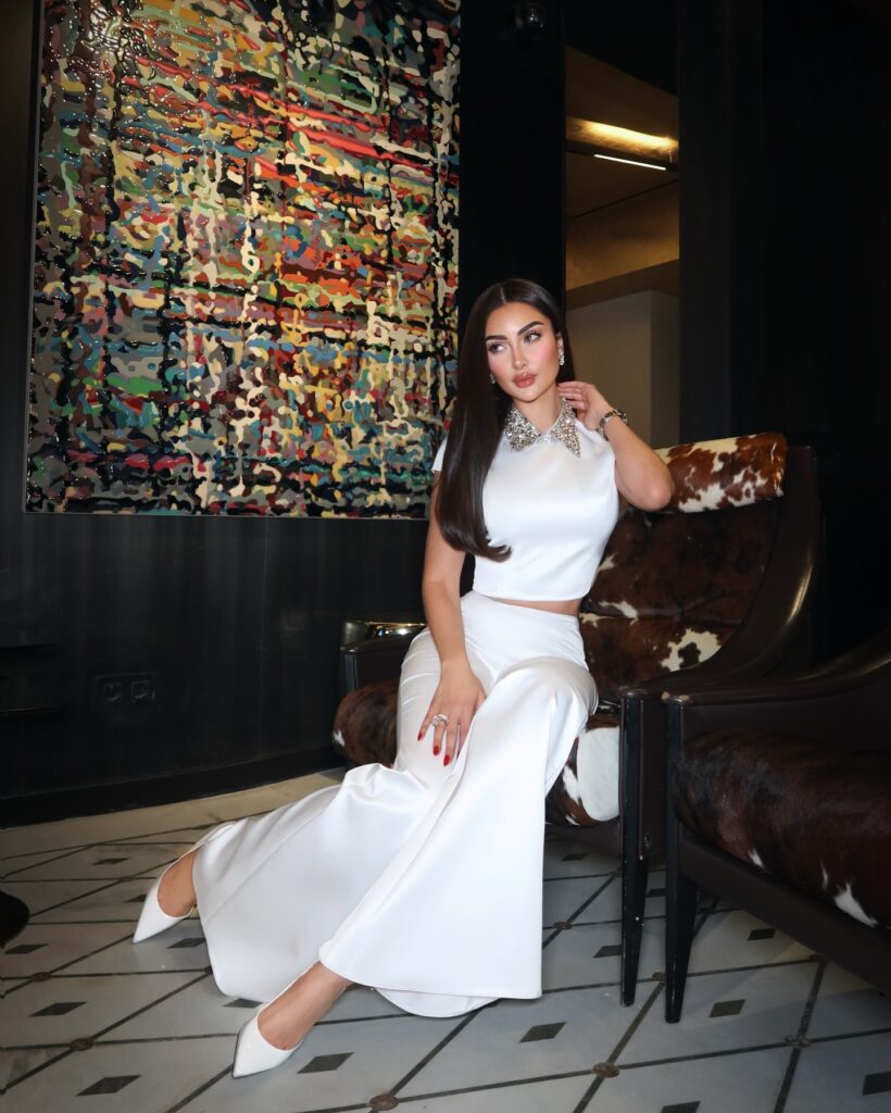 اختارت نور الغندور إطلالة كاملة باللون الأبيض، وهو من الألوان التي لطالما ارتبطت بالنقاء والرقي، خاصة في المناسبات الدينية والاجتماعية. جاءت إطلالتها عبارة عن طقم من قطعتين: توب ناعم بدون أكمام مزين بياقة مرصعة بالكريستال، وسروال واسع مريح بقصة انسيابية، ما أضفى لمسة عصرية على اللوك الكلاسيكي