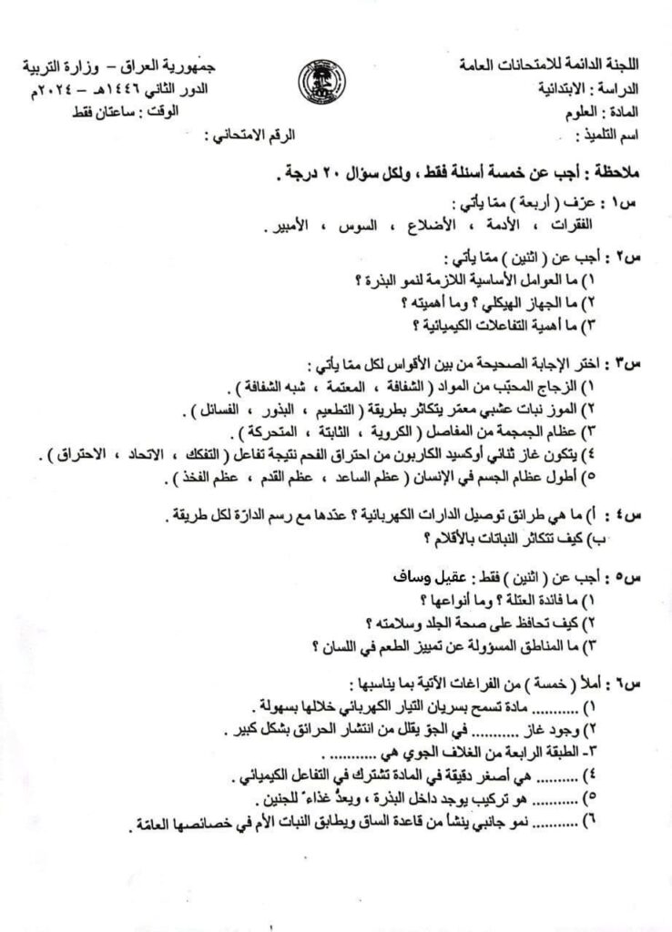 حصريا نرفق اليكم نسخة من اسئلة امتحان مادة العلوم للصف السادس الابتدائي الدور الثاني للعام الدراسي الحالي 2024