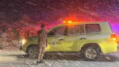 في ظاهرة جوية نادرة تساقط الثلوج في منطقة تبوك شمالي المملكة العربية السعودية حيث ظهر جبل اللوز مغطى بالثلج بالكامل…