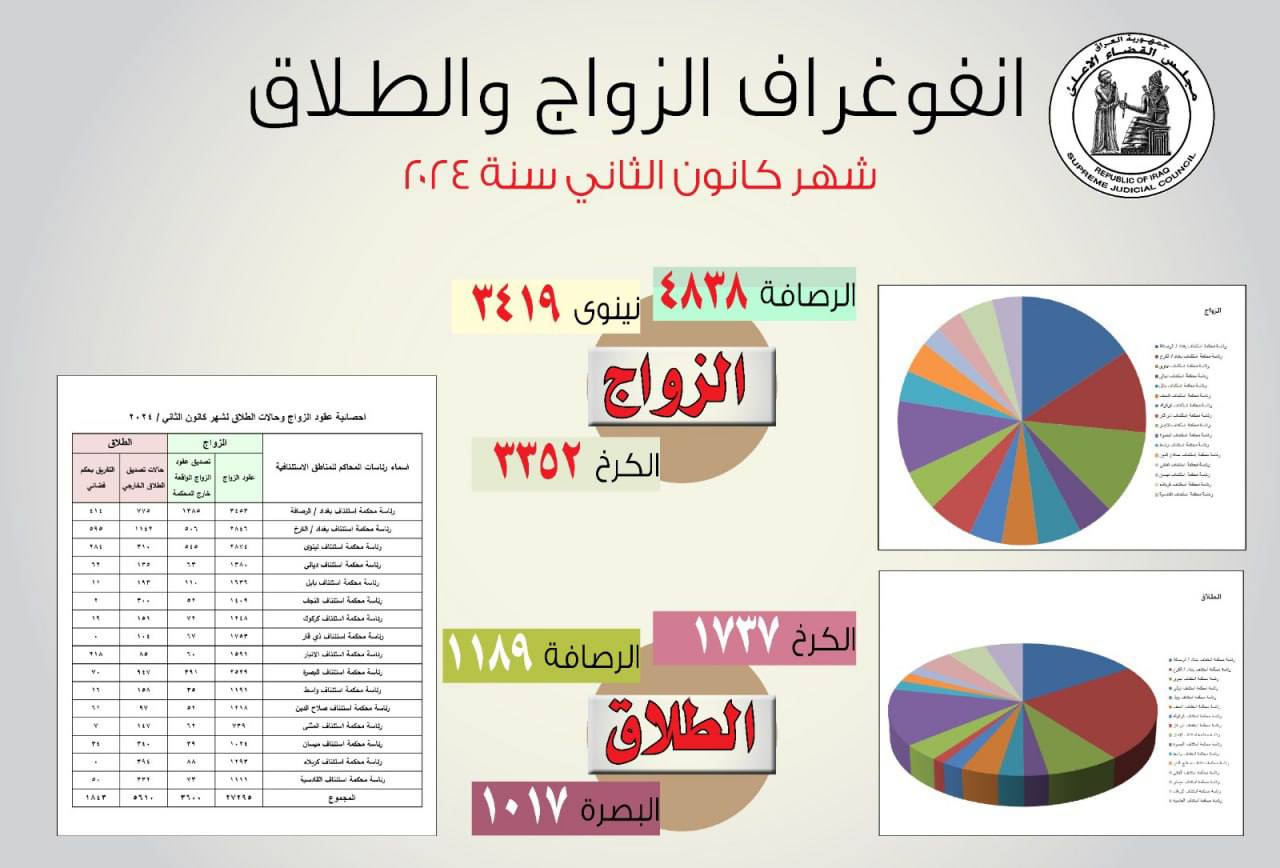فقد ارتفعت معدلات الزواج بشكل ملحوظ مقارنةً بالعام الماضي، حيث تم تسجيل 4838 عقد زواج في الرصافة، و3419 عقد زواج في نينوى، و3352 عقد زواج في الكرخ.