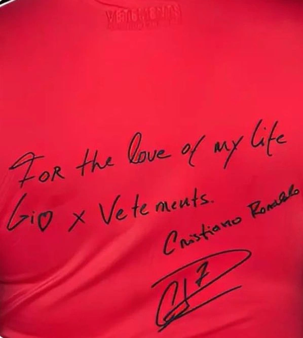 يحمل رقم واسم حبيبها نجم كرة القدم كريستيانو رونالدو، مع توقيع وهدية من الأسطورة نفسه.