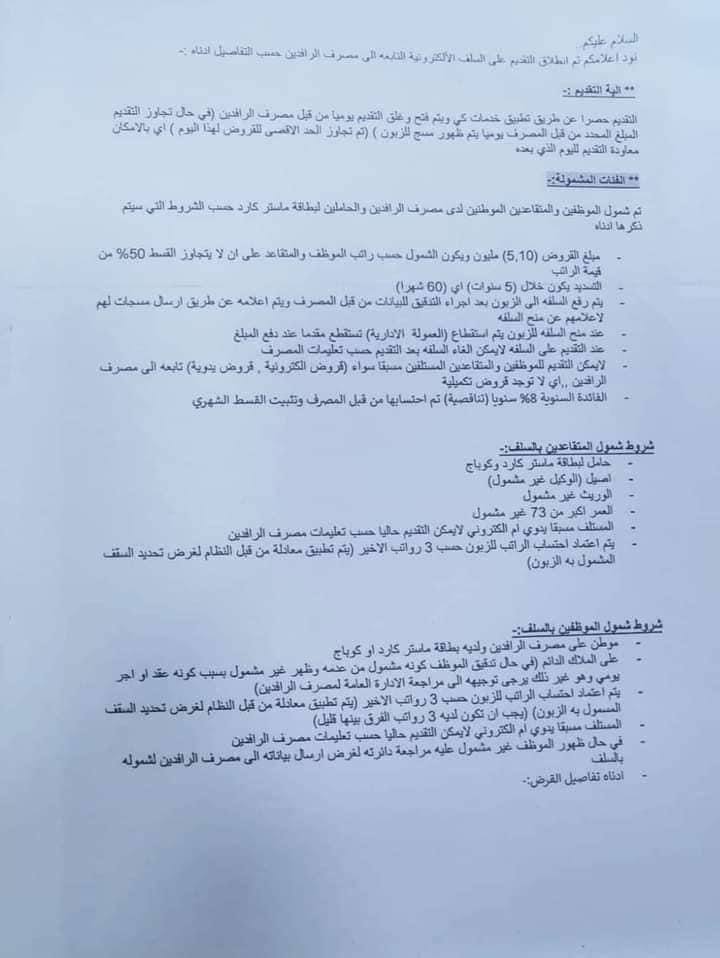 - يرجى مراجعة أقرب فرع لمصرف الرافدين للحصول على مزيد من المعلومات