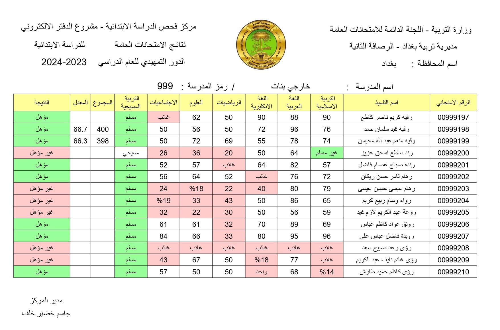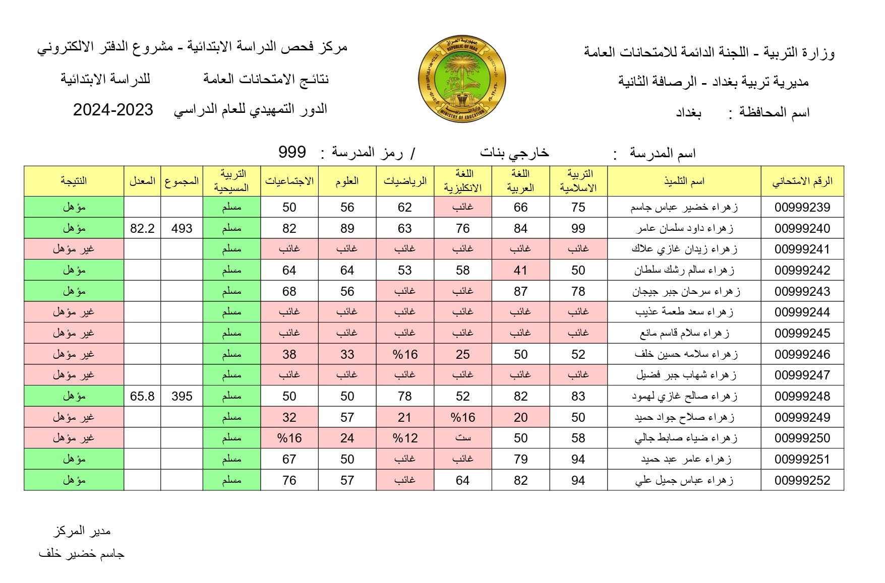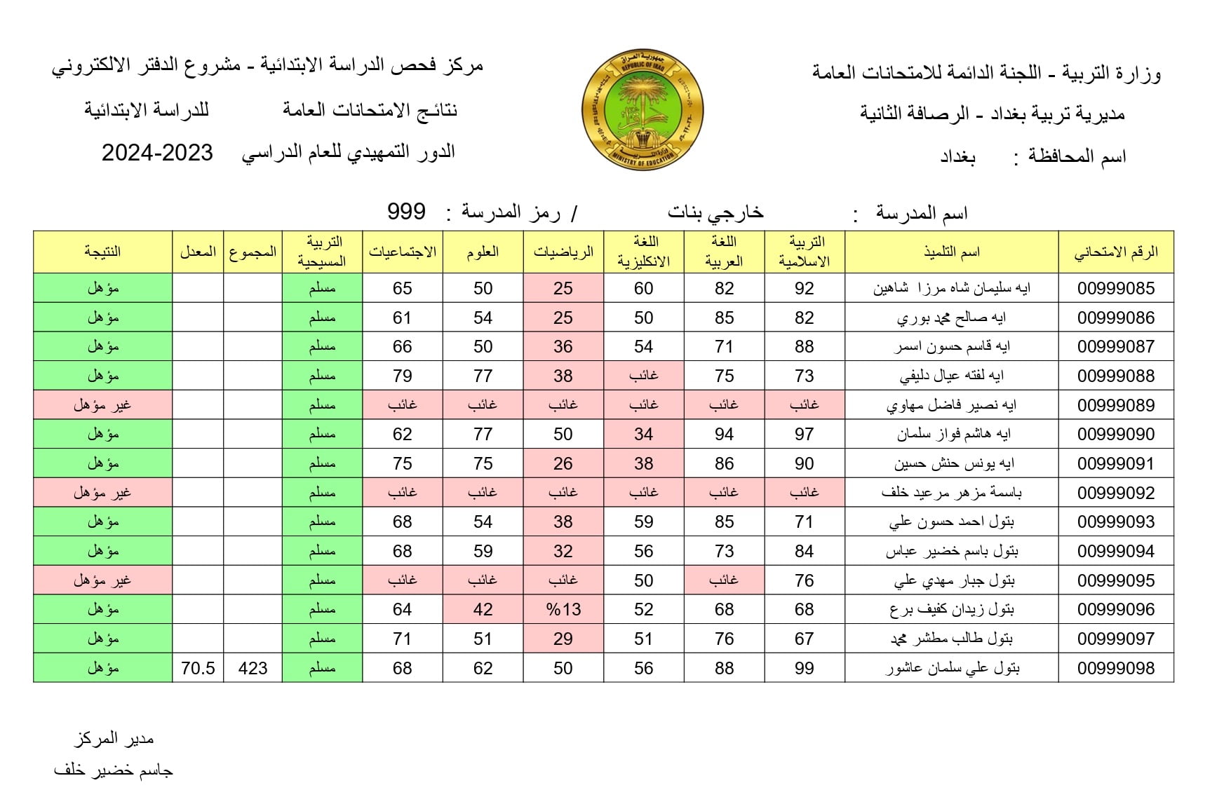عاجل وحصرياً عبر موقع هاشتاك نرفق اليكم نتائج امتحانات التمهيدية للصف السادس الابتدائي للعام الدراسي 2024 الرصافه الثانية