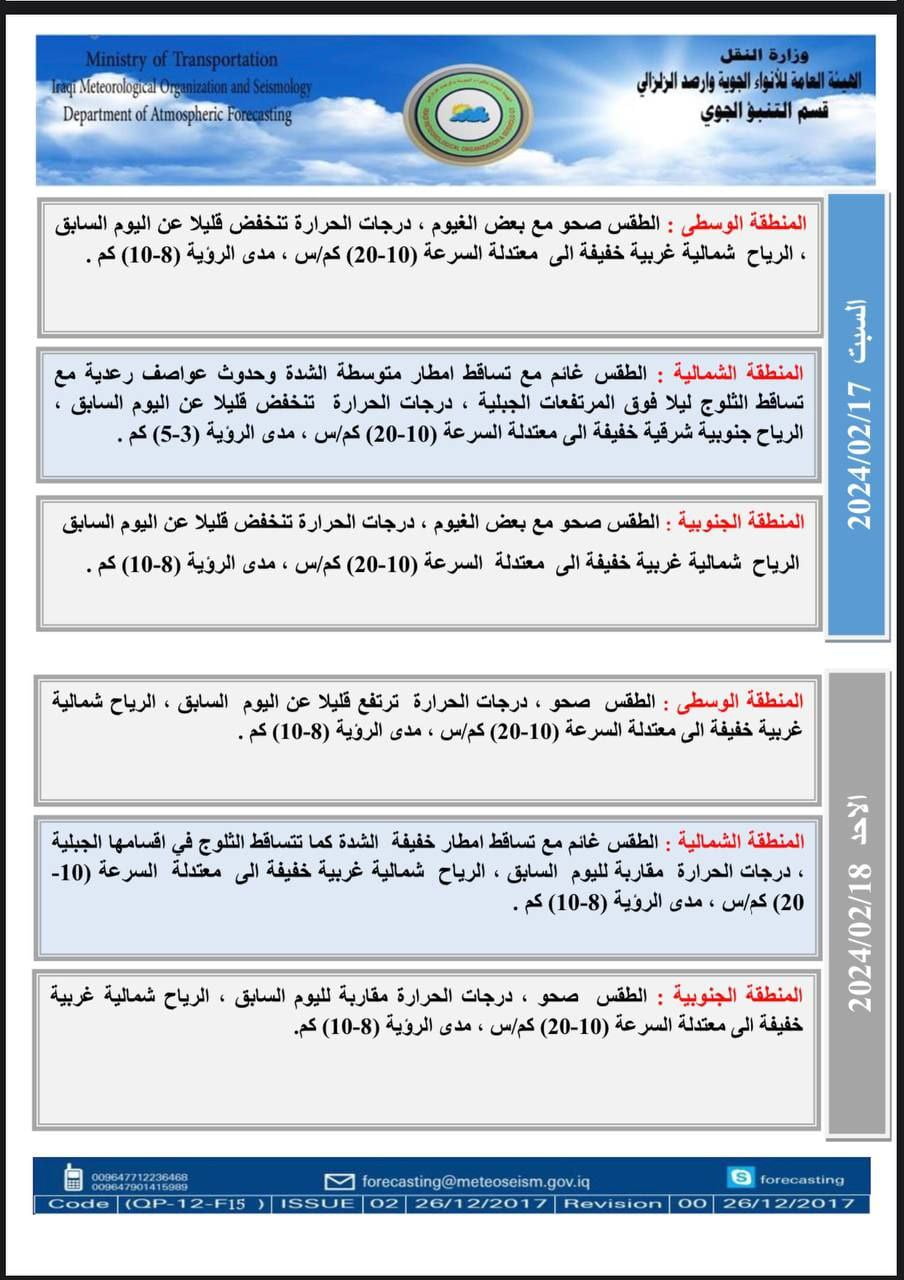 حيث ماتزال التحذيرات من غزارة الهطول اليوم تشمل مناطق من مدن شمال البلاد اضافة لديالى وشمال واسط و من متوقع سيول شرق ديالى وشرق واسط جهة الحدود و ضعف واضح في كميات الهطول في البصرة والناصرية وبادية الجنوب اليوم